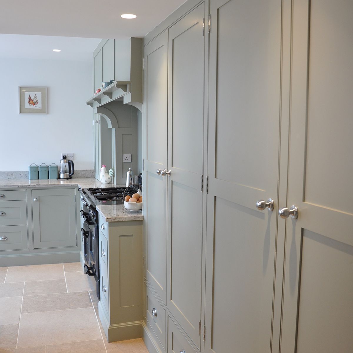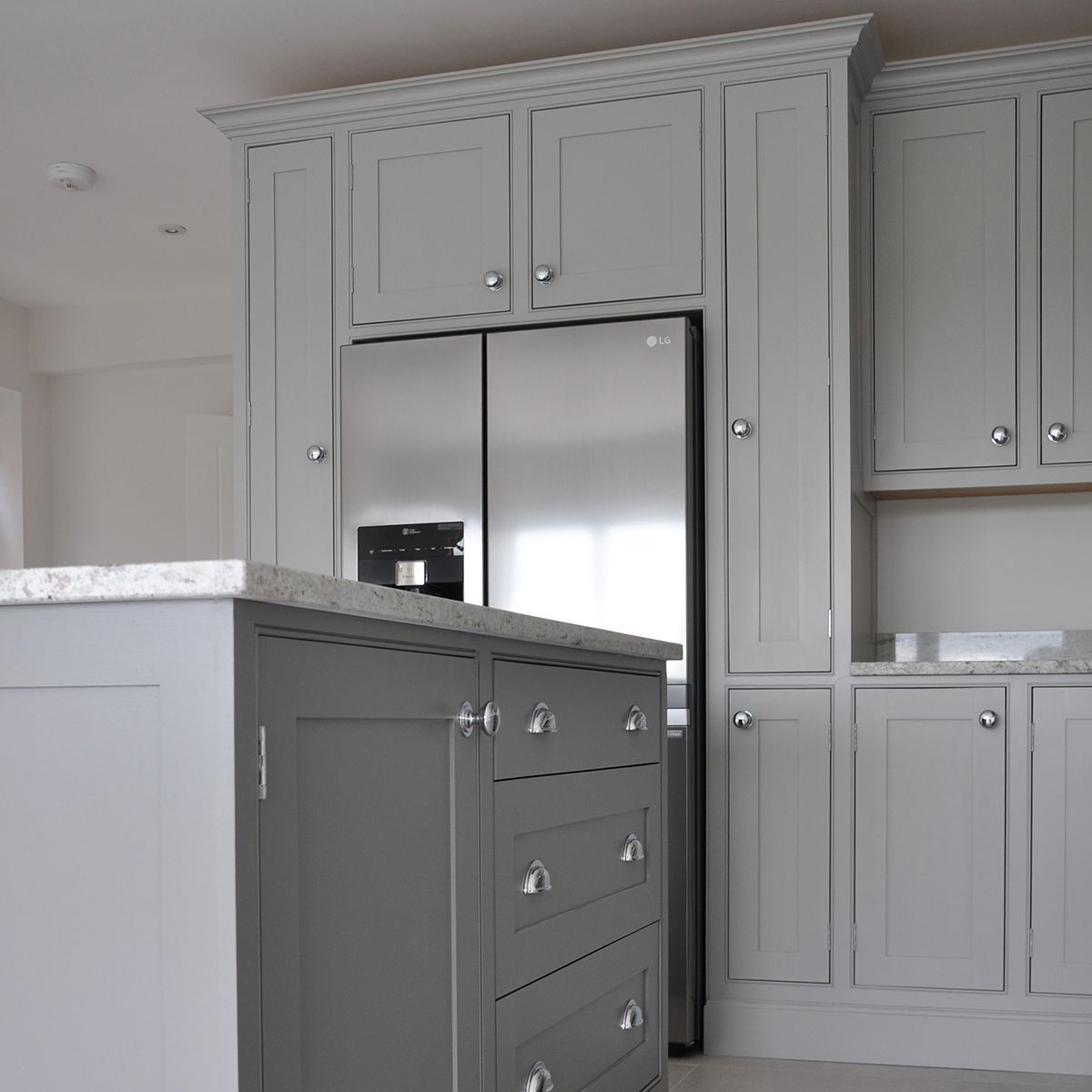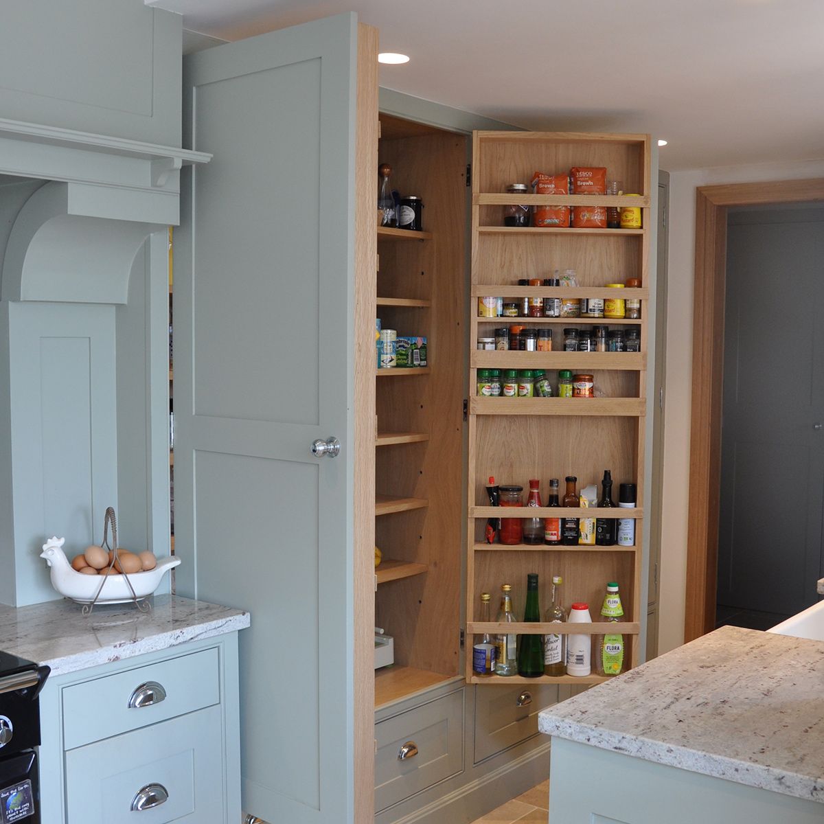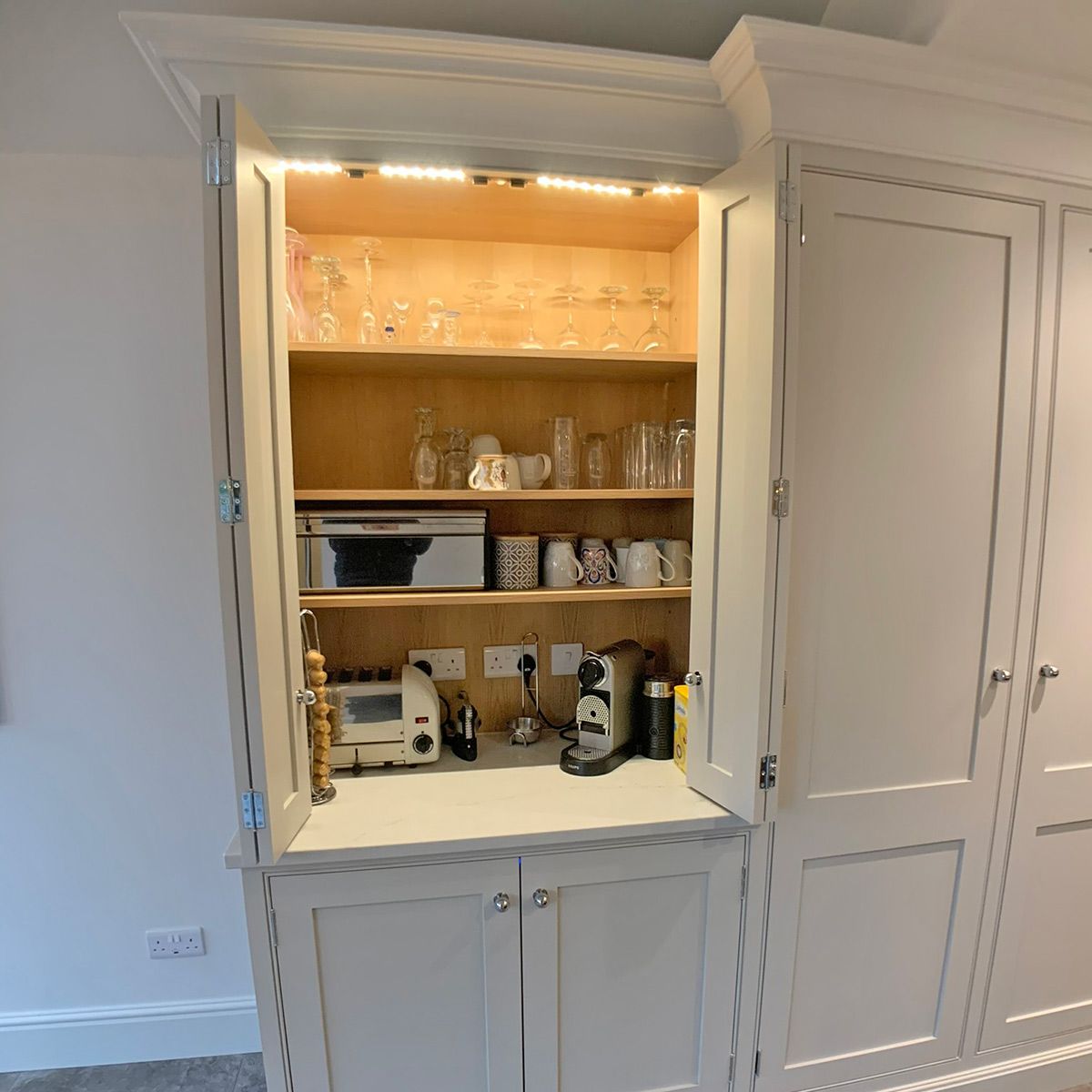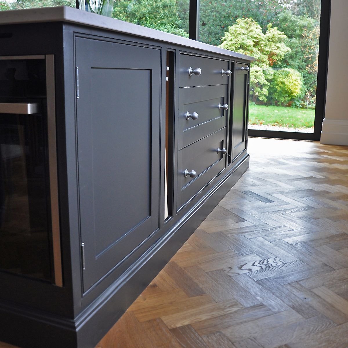 Always in-frame and oak veneered, (no melamine or chipboard here), our hand-painted made-to-measure cabinets are complimented by soft-close solid oak drawers with dovetail joints.